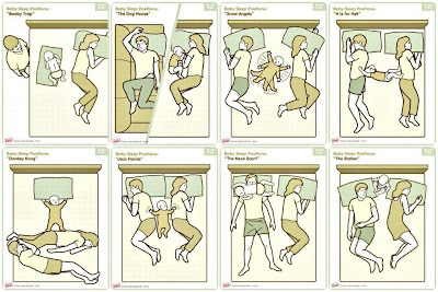 Dan and I have to laugh because Riley has been sneaking in the middle of the night lately and coming into our bed. We are both so sleepy, we lack the energy at that time of night to get up and put her back in her bed, so in the middle she squeezes. And our nighttime adventures insue. A friend posted this on facebook and I literally had tears streaming down my face from laughter! Dan and I can honestly say we have experienced just about all of these positions!